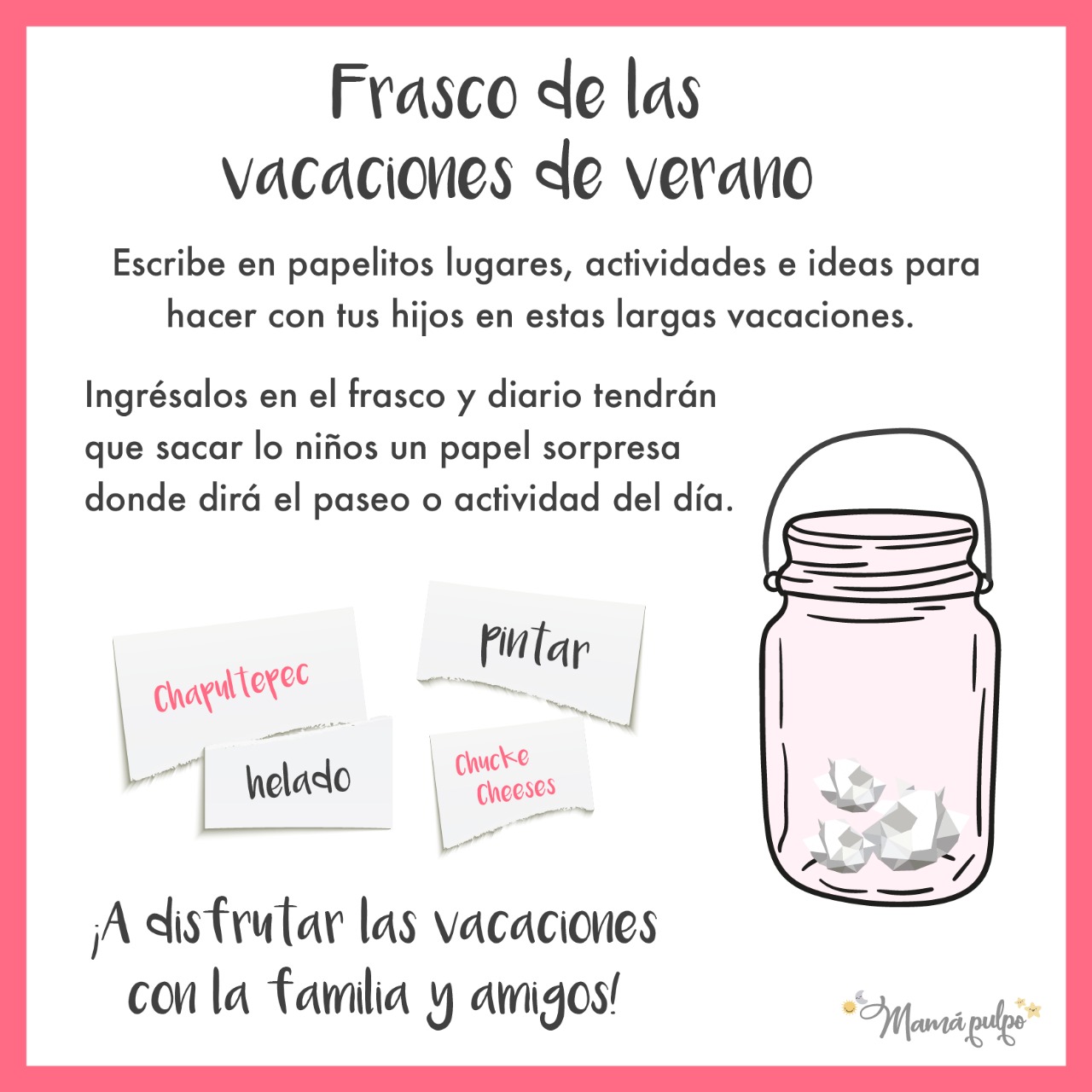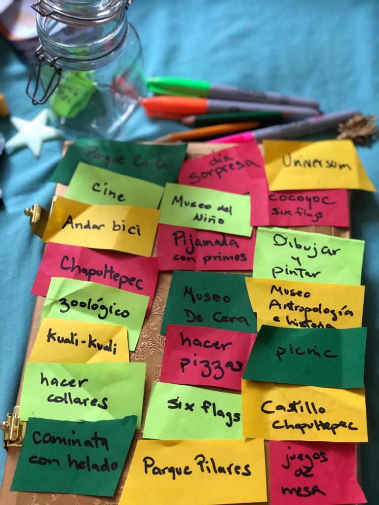 La idea es meter en un tarro, caja, o el recipiente que tengan papelitos con lugares, actividades, paseos por hacer, puedes poner tanto lugares que les encanta a tus hijos ir, lugares nuevos, culturales, de entretenimiento donde no se tenga que gastar necesariamente y actividades por hacer en casa.